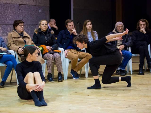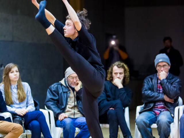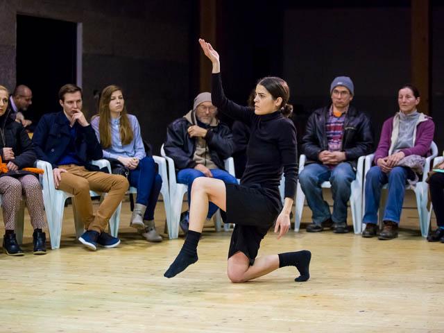 In collaboration with artists Matija Ferlin and Bojan Gagić, they create a dance performance which relies on the reshaping of the space of encounters and dance dialogue creation. A specific atmosphere is created by transforming the movements and the sound, and the dance duet becomes an homage to the other performer, as well as to the ones who are witness to their encounter.